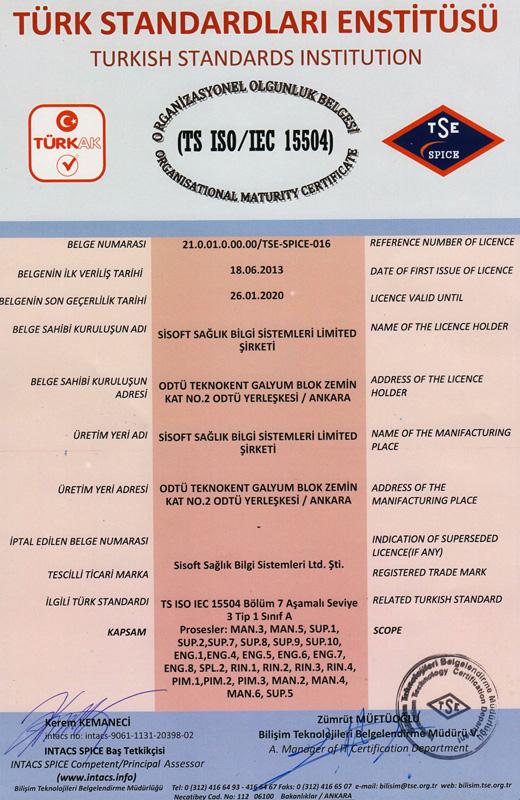 Sisoft Sağlık Bilgi Sistemleri alanında yine bir ilki başararak, TSE Belgelendirme Birimi tarafından gerçekleştirilen zorlu denetim süreci sonucunda Türkiye'nin ilk SPICE-Level 3 (Software Process Improvement and Capability - Yazılım Süreçleri İyileştirme ve Yeterlilik) TS ISO/IEC15504 Olgunluk Seviyesi 3 (SPICE Maturity Level 3) belgesini almaya hak kazandı.